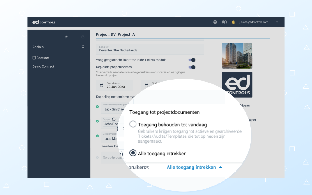 In Ed Controls zijn twee nieuwe functies geïntroduceerd die het beheer van projectdocumenten vereenvoudigen. Je kunt nu een Geïnformeerde of Geraadpleegde op projectniveau toevoegen aan alle documenten, vanaf de startdatum van het project of vanaf de datum waarop de persoon is toegevoegd. Deze gebruikers hebben dan toegang tot nieuw gecreëerde actieve items en gearchiveerde items. Deze nieuwe functie biedt meer controle en zorgt ervoor dat belangrijke betrokkenen altijd op de hoogte zijn van de laatste ontwikkelingen.