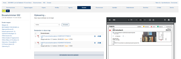 - Als dit overeenkomt, wordt gekeken of er minimaal twee handtekeningen aanwezig zijn in de audit. Is dit het geval, dan wordt een pdf-rapport geplaatst in HomeCTRL bij het betreffende kavelnummer (zie Figuur 1). In de weergave van het ticket wordt de compacte versie gehanteerd. Dus geen verantwoordelijke of verdere tijdslijn wordt getoond in de ticket-informatie.